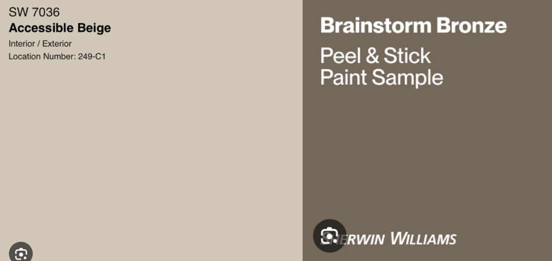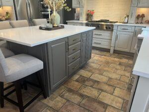 For the island cabinets, Heather knocked it out of the park with a rich taupey-bronzey Brainstorm Bronze. The Brainstorm Bronze perfectly picked up the taupe grout on the floor, grounding the kitchen beautifully.