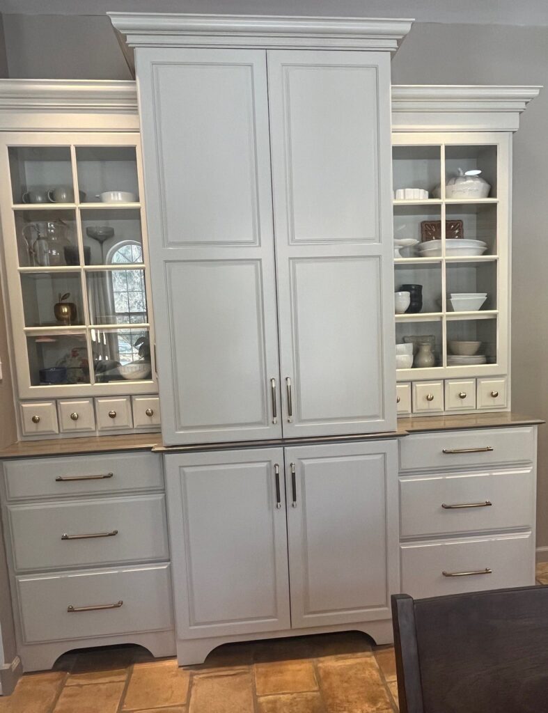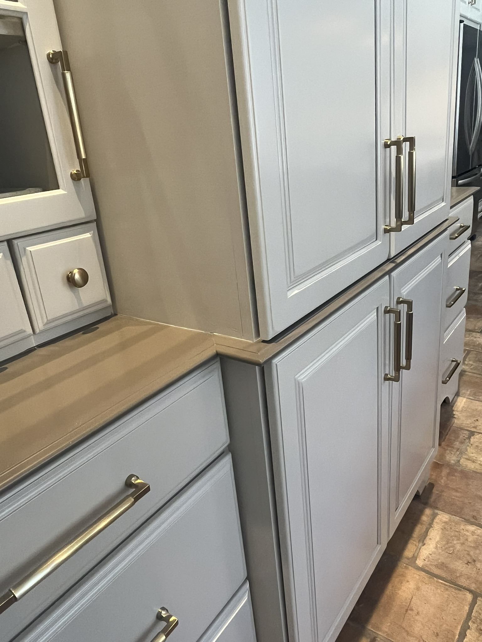 We also used it on the horizontal surface of our full-height cabinet hutch, so the piece continues to read more like furniture (with its apothecary drawers).