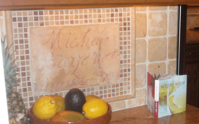 Crazy story around this tile, and why it’s so important to us: Back in 2007, when the installer unpacked the boxes of tile, they were caked in clay and mud from when they were removed. One of the tiles had handwriting on it that said: Michel Biaze’mette and then Massoner 1799. Since “maison” means house in French we think, (or maybe we wanted to believe) that Michel might have been the builder or owner who signed the tile. We thought this was so cool we had the tile framed as part of our backsplash where it became a conversation point for the last 19 years.
