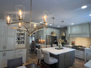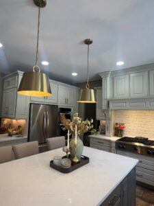 I was concerned that the white tones in the backsplash and counter would look too bland, so I wanted strong pendants in a Bronzed Gold finish to hang over the island and break up all that creamy white.